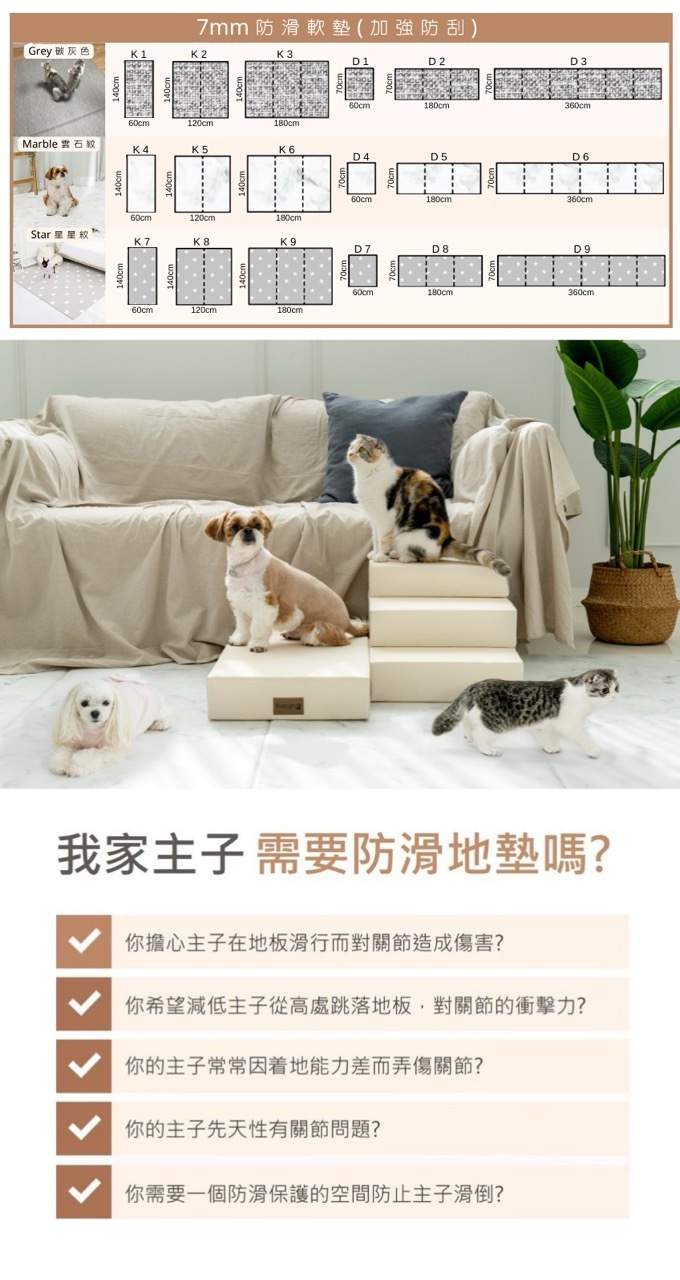 7mm加强防刮防滑保護軟墊。無論是活潑年幼還是年長寵物都有機會在地板上跑跳時滑倒。寵物因滑倒而損傷關節的情況,并不是罕見的。而關節損傷除了引來額外醫療開支之外,康復期也不短,影響家人的日常生活。爲了避免寵物滑倒,保護關節,Dfang 寵物防滑保護軟墊是寵物家庭必備之選。