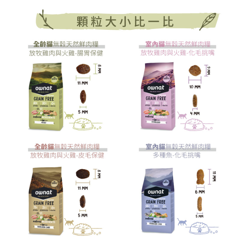 Ownat 無穀物乾糧系列是一種營養替代品,它模仿生活在大自然中完全自由的狗或貓,它們的身體已經準備好自發地遵循飲食習性。狗和貓的消化系統不能消化未經煮熟的穀物,雖然它們可以消化煮熟的穀物,但這也可能是食物致敏和不耐受症狀的來源,這就是我們從無穀物配方中完全去除穀物的原因。高比例的動物來源成份以及新鮮肉類可提供更高水平的生物價值蛋白質,這些蛋白質提供必需氨基酸,這些氨基酸對於身體的正常發育和功能至關重要。