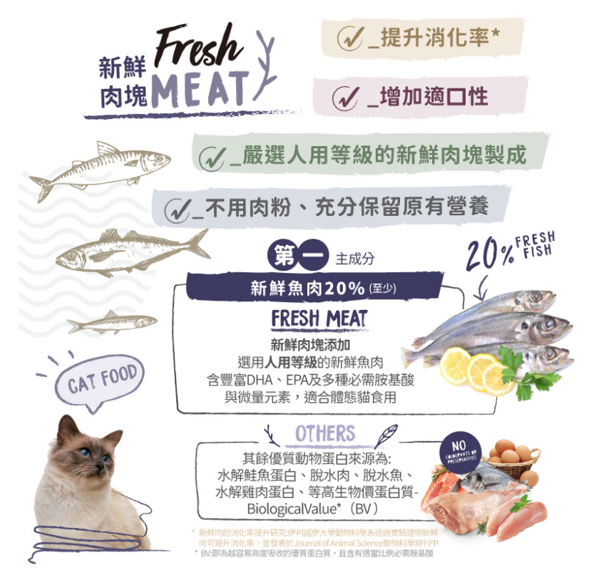 - 產品以最少20%*新鮮魚肉為原材料,新鮮肉所帶來的優質蛋白質能釋放更佳必須要的氨基酸