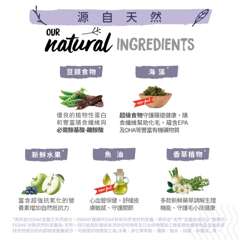 - 符合FEDIAF Good Practices Code 指定標準定義之天然成份