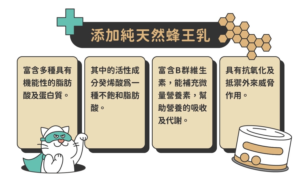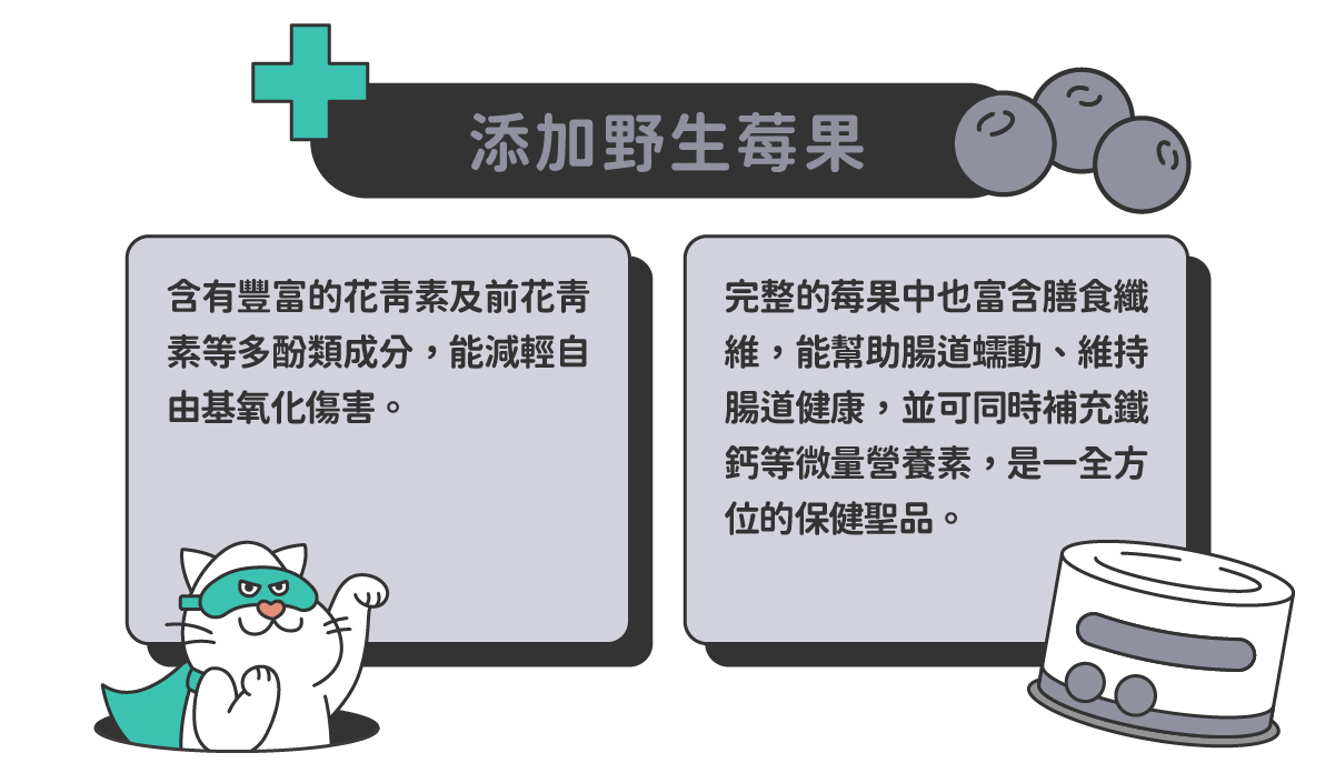 添加超級食物【褐藻】、【諾麗果】、【銀耳】、【野莓】、【蜂王乳】等天然的超級食物,為毛孩提供全面性的健康照護。