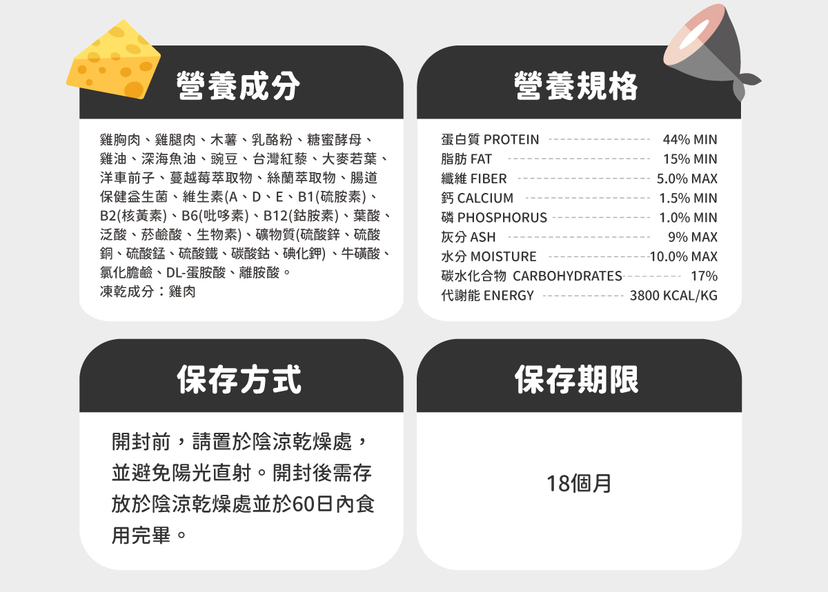 ✔ 特別添加頂級魚油提供omega-6脂肪酸和omega-3脂肪酸以及鱉蛋粉、膠原蛋白及卵磷脂,維持皮毛良好狀態